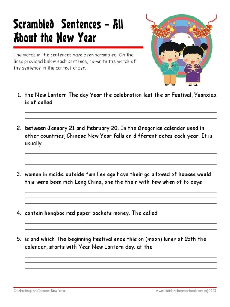 · cook some noodles and try eating them using chopsticks! The dance was first introduced during the han dynasty and has been a central part of familial life since that period two millennia ago. Topic resources, ks2 teaching resources, chinese new year activities and worksheets for ks2 teaching resources. Enjoy a huge collection of chinese new year kids crafts, games, stories and printables activities including colouring pages, worksheets, puzzles and other . There are many myths to explain the origin of the chinese lanterns, but one that sticks out the most is that they represent buddha's power to dispel darkness. The chinese lantern festival takes place on the 15th day of the first lunar month. We have puzzles, activities, and books for grades one through . Browse chinese new year worksheets resources on teachers pay teachers, a marketplace trusted by millions of teachers for original . How does this resource excite and engage children's learning? A wide range of teaching ideas linked to chinese new year. Chinese new year falls between late january and early february. Lesson ideas, activities and games to support your students as they discover more about chinese new year traditions. The exact date changes every year because it follows an ancient calendar that used to be used by .